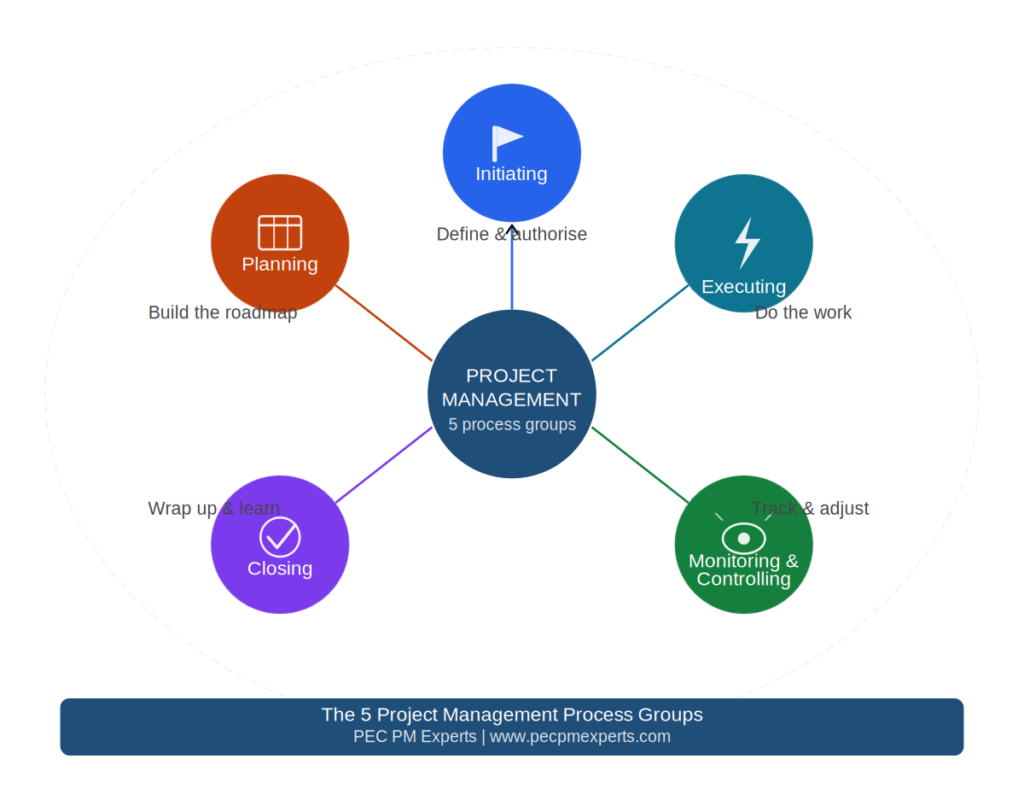 At PEC PM Experts, we structure our training around these process groups to give our students a systematic understanding of how projects work — and how to manage them effectively from initiation to closure.